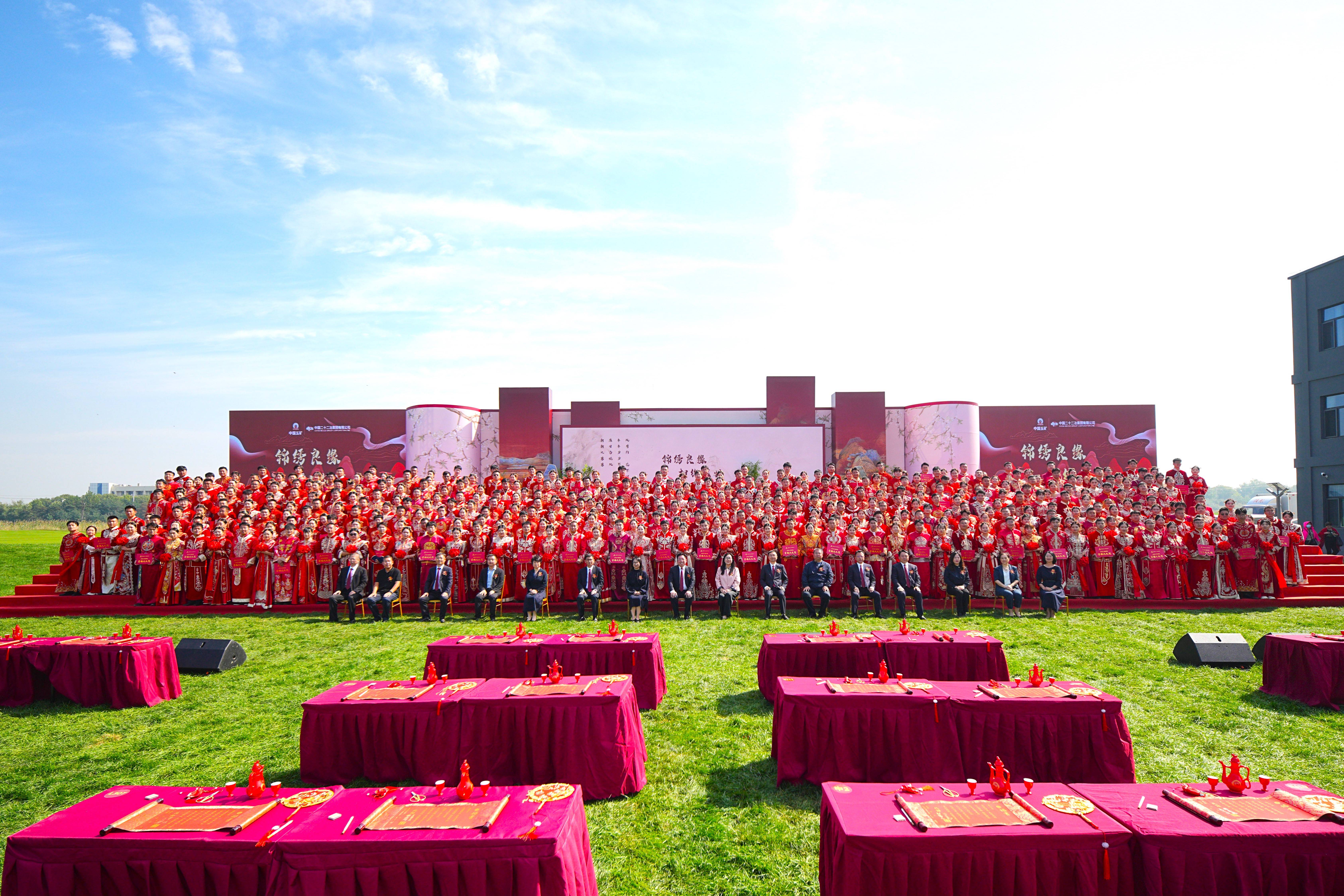 吉時已到,華燈初上。至親摯友歡聚一堂,共賀新禧,同證鴛盟。203對新人執(zhí)紅綢相牽,踏錦毯徐行。新娘鳳冠流彩,團扇半掩芙蓉面;新郎紅袍玉帶,眉宇盡展英氣。八方賓客共睹此天作之合,百對新人同締山海之盟,滿座皆沐華夏婚儀之雅韻,共仰千年禮樂之風華。